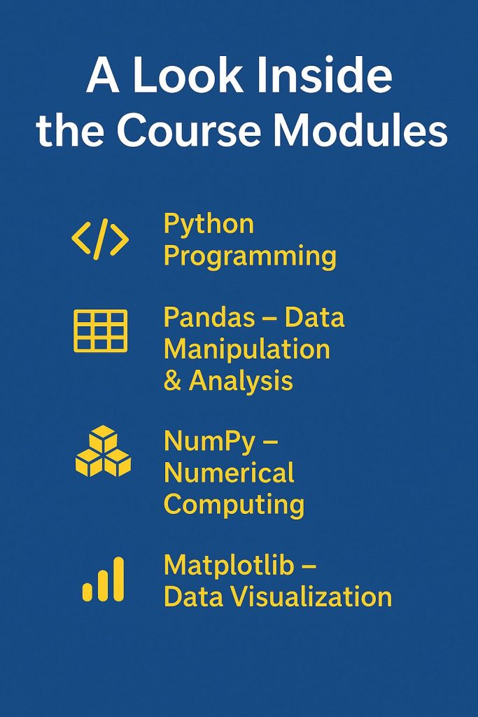 This hands-on data analytics training is built for students, professionals, and career changers ready to enter the data world. You’ll learn Python from scratch, then master Pandas, NumPy, and Matplotlib to analyze and visualize real datasets. By the end, you’ll have portfolio projects and a certificate to showcase your job-ready skills.